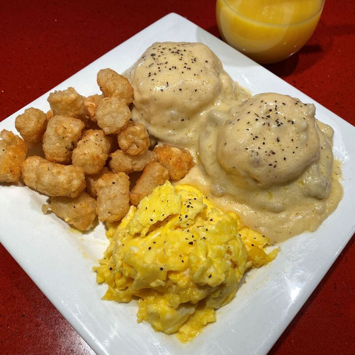 scrambled eggs & kit-tots with two buttermilk sausage biscuits topped with sausage gravy.